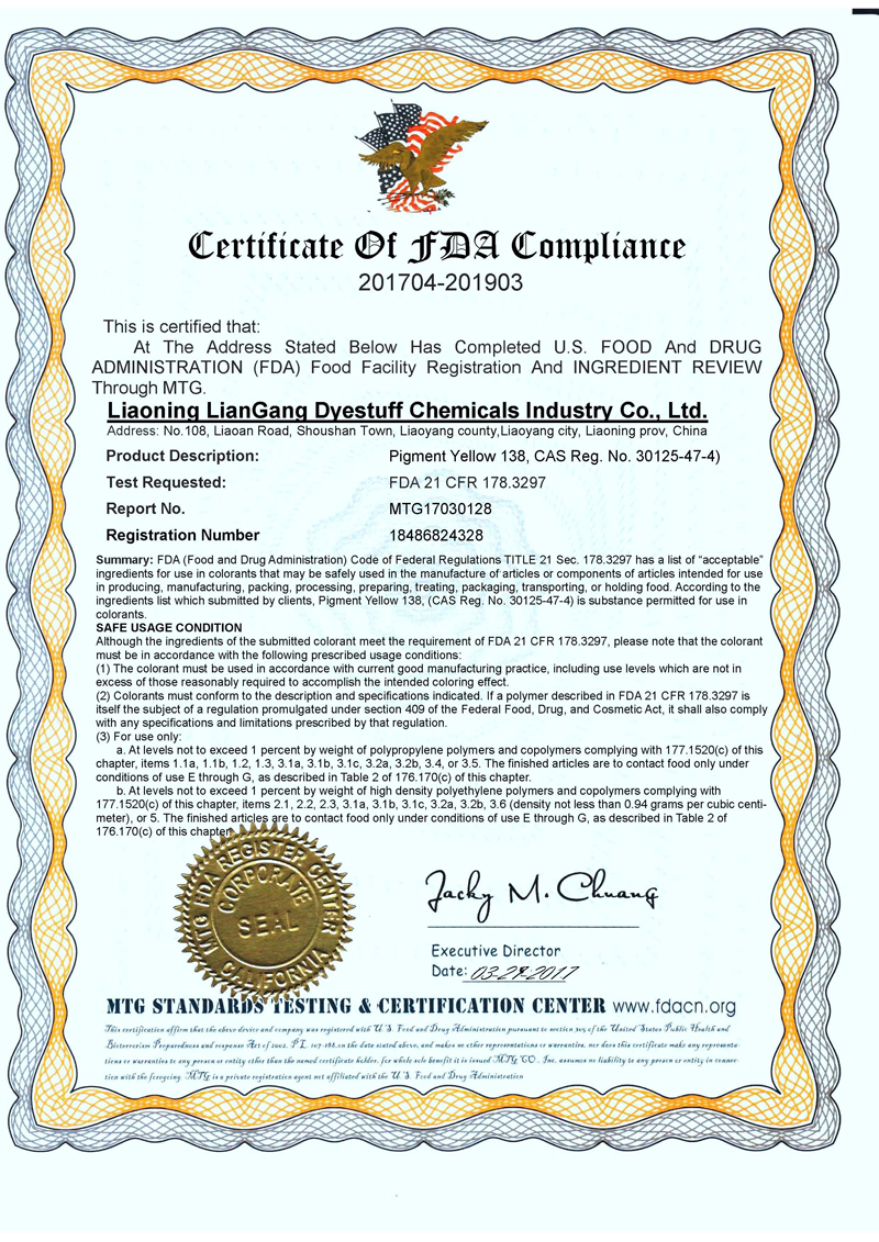 顏料黃138 (Pigment Yellow 138) 已通過(guò)FDA認(rèn)證