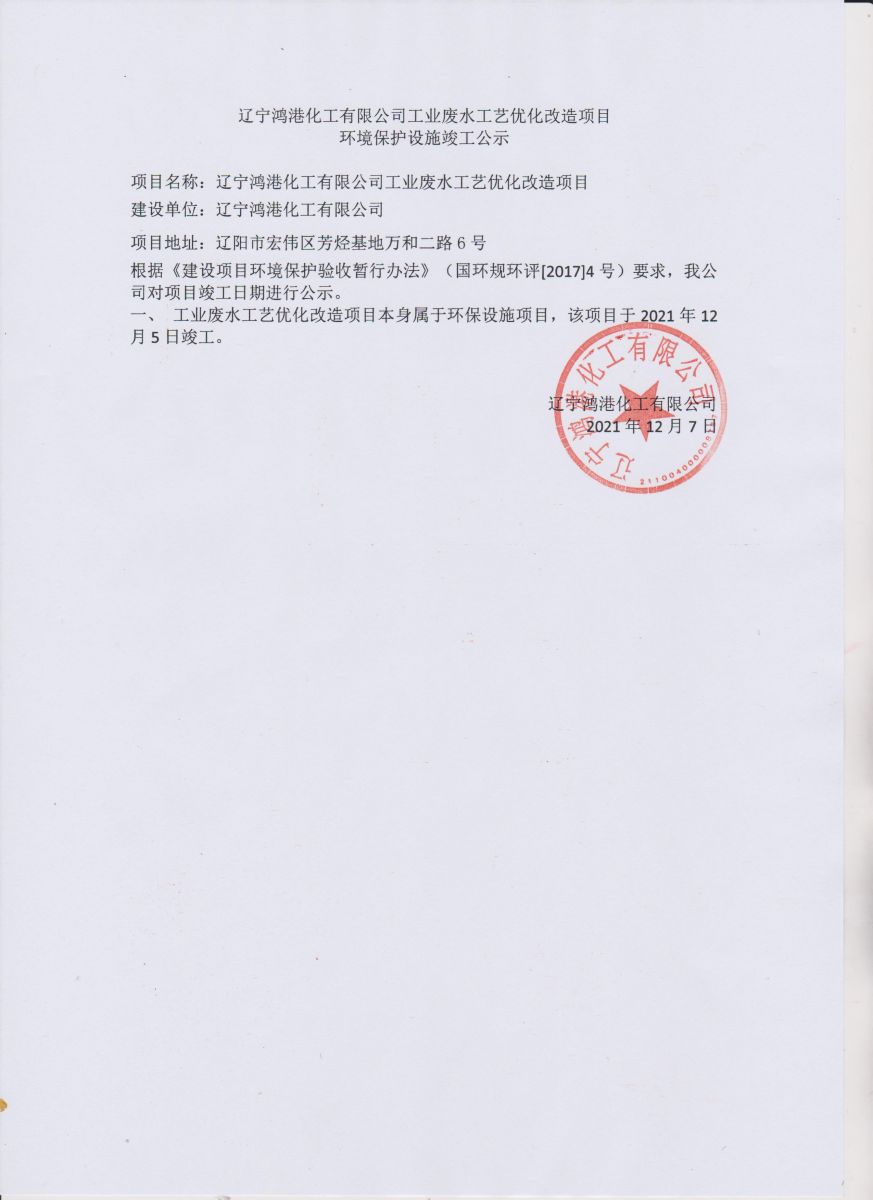遼寧鴻港化工有限公司工業(yè)廢水工藝優(yōu)化改造項目環(huán)境保護設(shè)施竣工公示